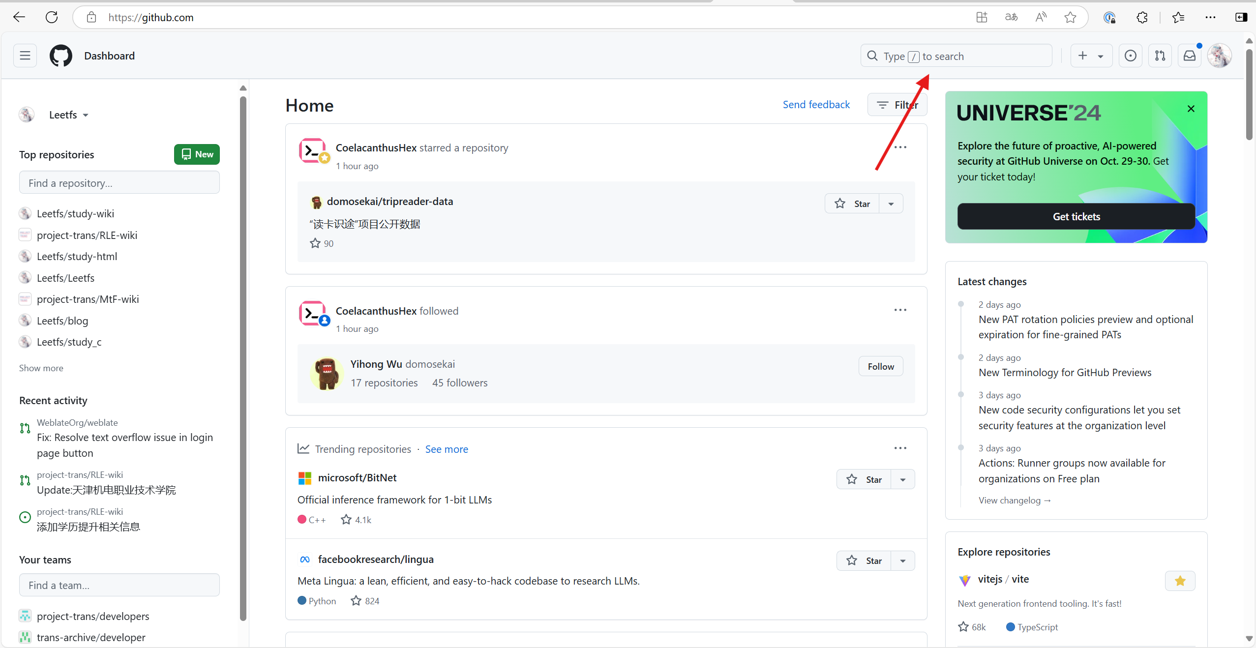打开首页,通过搜索栏找到想要做出贡献的仓库,也可以通过仓库链接直接跳转。